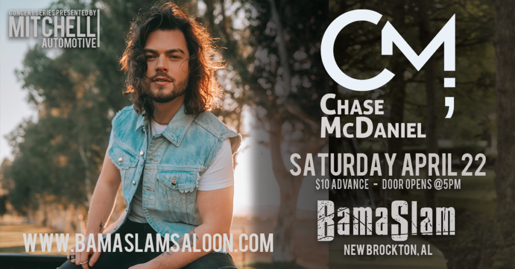 Mitchell Automotive welcomes Chase McDaniel at Bama Slam! This Rising country singer and songwriter broke out of Nashville in 2022. His song, “Project” debuted at NO.1 on the iTunes Country Chart and later reached NO.1 on the Billboard Country Digital Song Sales Chart. Get ready to grab your boots and dance the night away! You don’t want to miss this show!! Doors open at 5PM!